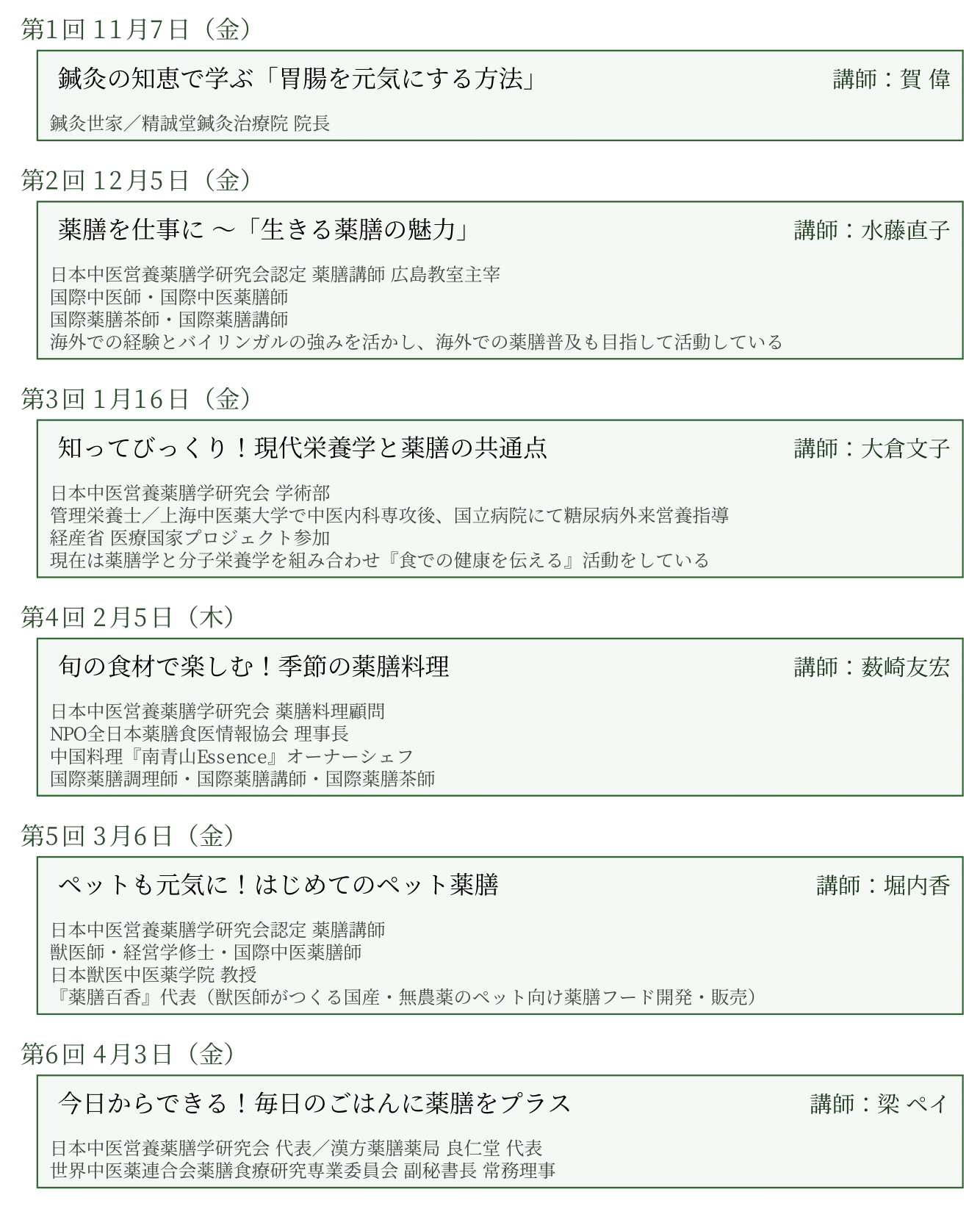 ※ メールでのお申込なさる方は、お名前(フリガナも)、ZoomID、ご受講後希望回、薬膳に関するご経験 (関連資格を所持・初歩知識あり・初心者など)をお知らせください。